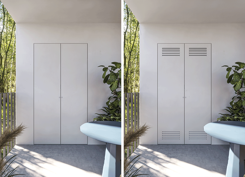 - Beltéren a fal síkjába süllyesztett nyíló ajtó, amely teljesen idomul a környező falhoz.